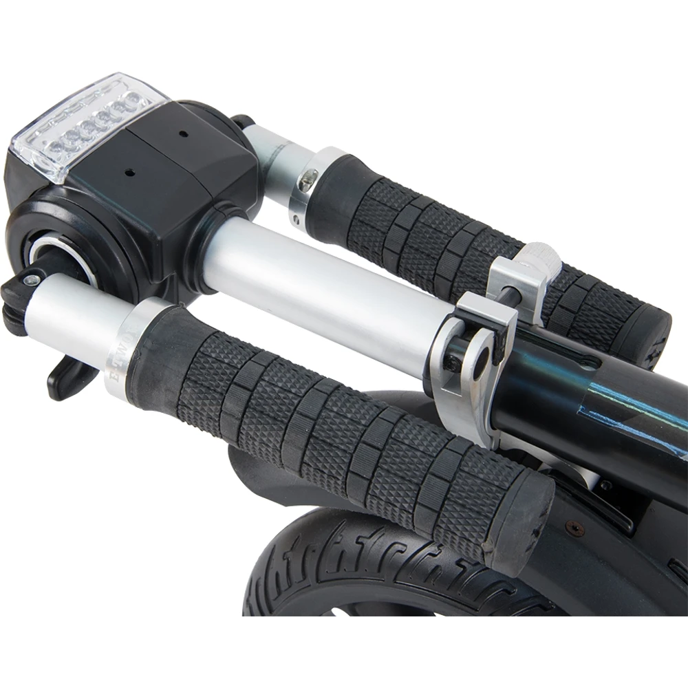 Электросамокат Generic E-twow S2 ECO легкая версия, его масса 10.5 кг. В сложенном состоянии занимает очень мало места. Легко носить в руках, нет проблем с хранением. Не смотря на вес, усиленная конструкция самоката выдерживает нагрузку 120 кг. Это отличительная черта E-twow.