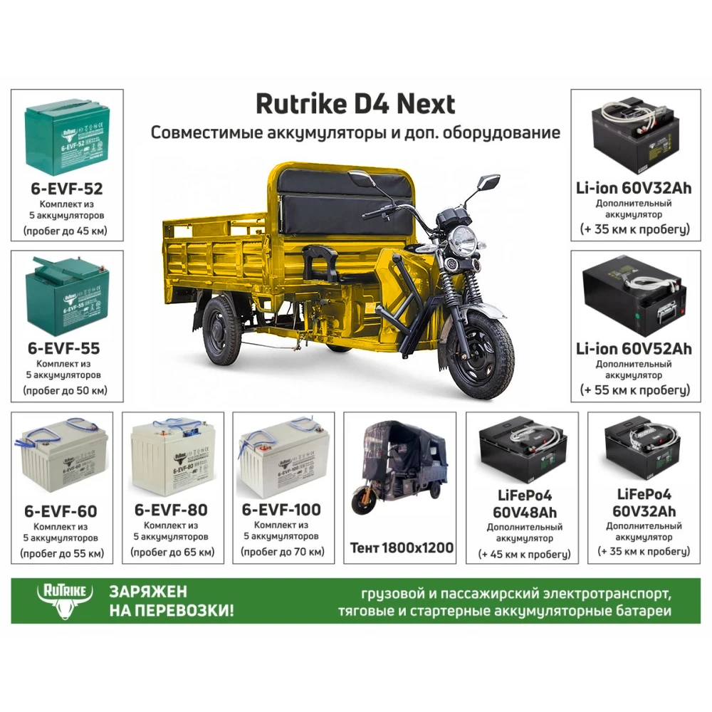 Отличительной особенностью данного транспортного средства является его уникальный желтый цвет, который не только привлекает внимание, но и обеспечивает легкую идентификацию на дорогах.С радиусом пробега до 80 км на одном заряде, электротрицикл Rutrike D4 NEXT 1800 60V1200W обеспечивает эффективность и долговечность работы. Это идеальное решение для города, где важна маневренность и экологичность.Вес транспортного средства составляет 240 кг, что в сочетании с мощностью двигателя в 1200 Ватт гарантирует высокую производительность и стабильную работу на протяжении всего дня.Тип аккумулятора Li-ion и его ёмкость в 60V обеспечивают долгий срок службы и надежность использования. Максимальная нагрузка на электротрицикл может достигать 1200 кг, что делает его незаменимым помощником в транспортировке грузов.Максимальная скорость 25 км/ч позволяет оперативно перемещаться по городским улицам, минуя пробки и заторы. Время зарядки аккумулятора составляет всего 5-8 часов, что обеспечивает быстрое восстановление работоспособности.Приобретая Rutrike D4 NEXT 1800 60V1200W у официального дилера, вы получите гарантию качества и профессионального обслуживания. Этот электротрицикл - верное решение для тех, кто стремится к эффективности, надежности и экологичности.