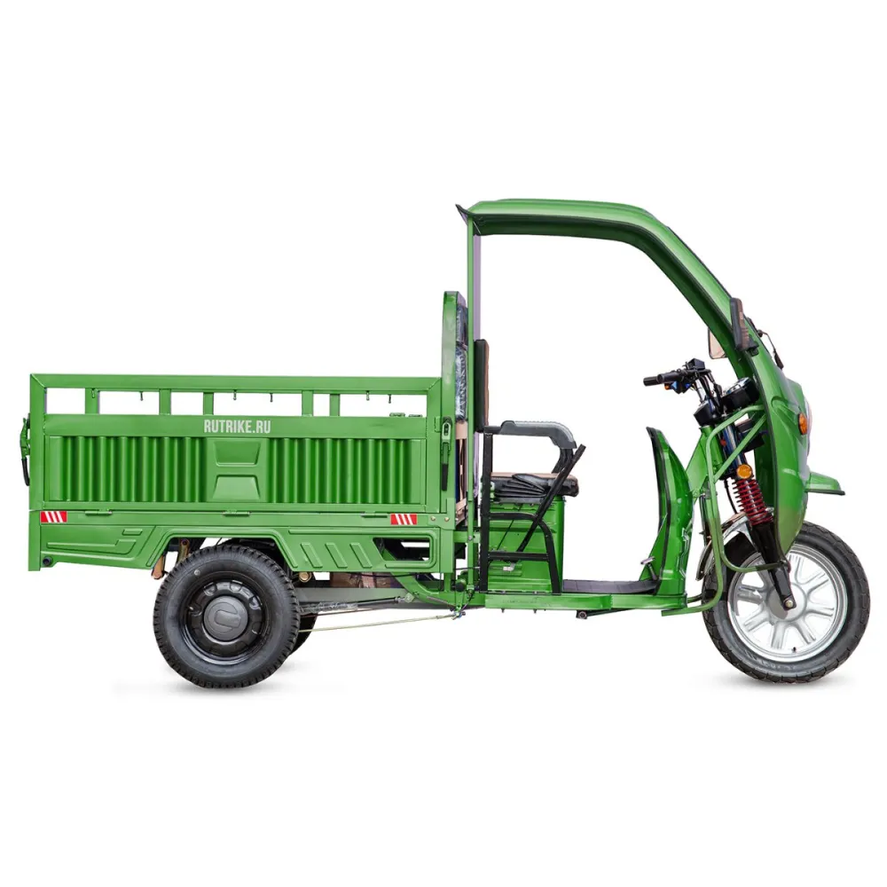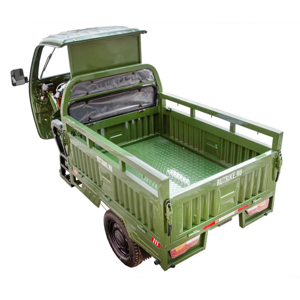 Грузовой электротрицикл Rutrike Гермес 1500 60V1200W темно-зеленого цвета - это надежный транспортный средство для перевозки грузов. Его мощность, грузоподъемность, всесезонная эксплуатация, барабанные тормоза и усиленные гидравлические амортизаторы в передней подвеске делают его отличным выбором для различных бизнес-потребностей.
