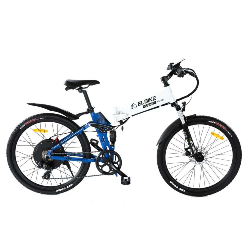Электровелосипед Elbike HUMMER ELITE 13 Синий – выглядит круто на фоне другой, аналогичной техники. Рама выглядит массивно и современно за счет брендовой надписи и наличия в ней емкой батареи. 26 дюймовые колеса с цепкими покрышками предназначены для езды по бездорожью и другой проблематичной местности. Также техника может использоваться в качестве ежедневного варианта.