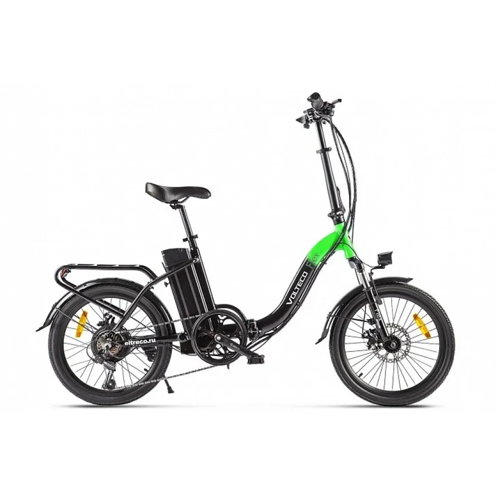 Сегодня электровелосипед, в данном случае модель VOLTECO FLEX UP черно-зеленого цвета, не является средством передвижения только для людей пенсионного возраста, которым тяжело передвигаться пешком и крутить педали. Пользуется большим спросом как полноценный тренажер, для эффективной кардиотренировки, средство передвижения у  активных людей, мужчин и женщин. Для прогулки по городским местностям и для поездки за город, на дачу, работу. Оснащен 7 скоростями, что вполне достаточно.  Постоянно совершенствуется. Легкая в управлении и эксплуатации модель, идеальное сочетание мотора и сбалансированной подвески. Если вы не можете решится на покупку, то здесь представлены одни заманчивые плюсы: Багажник  сохраняет свою функциональность для перевозки тяжелого груза. Но не следует забывать, что общая масса с водителем не должна превышать 120 килограмм. Установленные дисковые тормоза, которые позволяют быстро остановиться в случае необходимости, обеспечивают контроль торможения даже в сложных условиях, влажном покрытии. Алюминиевая высококачественная рама, усилена эргономичным проектированием.