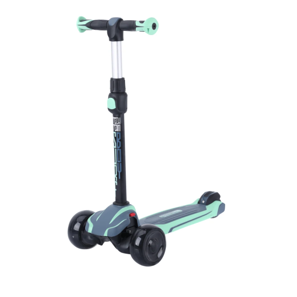 Рукоятка имеет удобные формы и прорезиненную экологически чистую поверхность. Препятствует соскальзыванию ручек. Минимизирует риск неудобств и падения ребенка. Колеса – полиуретановые, большие. Передние и задние представлены размерами 120*50 и 80*50 мм соответственно. Самокат оснащен современными подшипниками и амортизаторами, гарантирует отличный накат, не взывает дискомфорта при пересечении каменистой местности. Во время езды включается светодиодная подсветка, делающая технику более привлекательной.